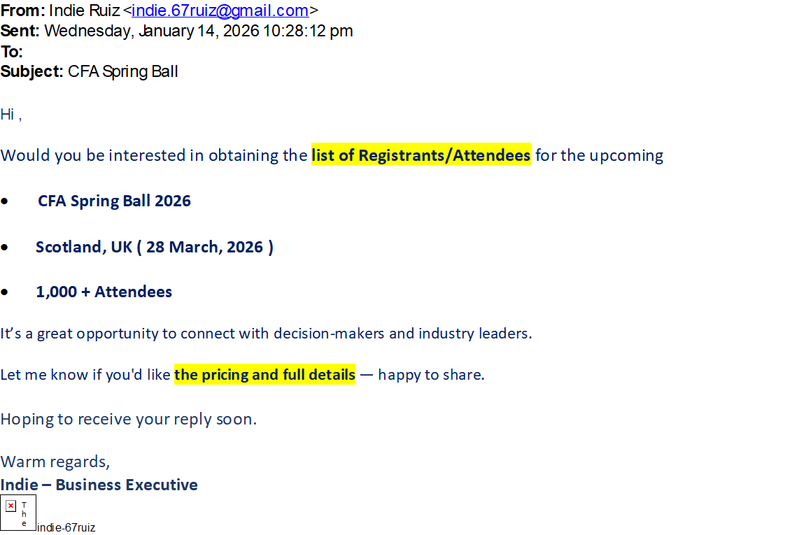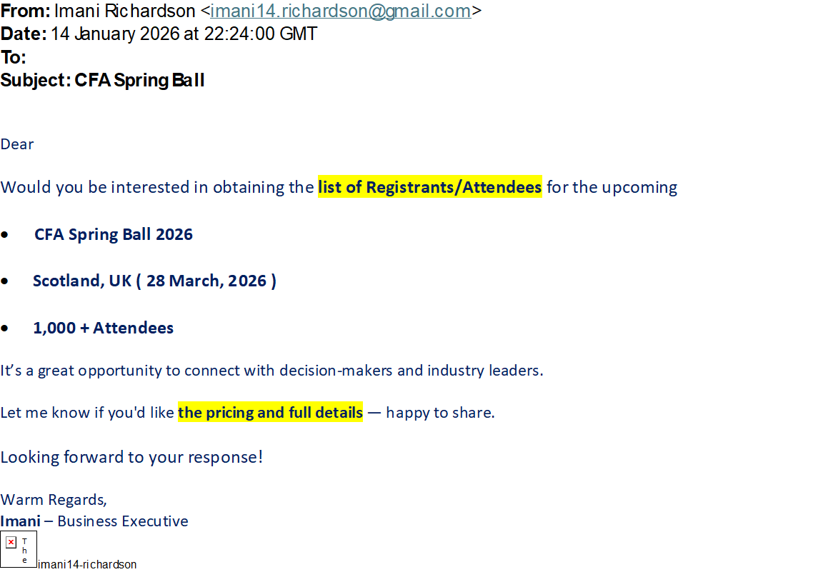 The CFA always takes action when members receive spam or spurious emails and can confirm that we have issued the senders of the spam/scam a cease and desist instruction.
