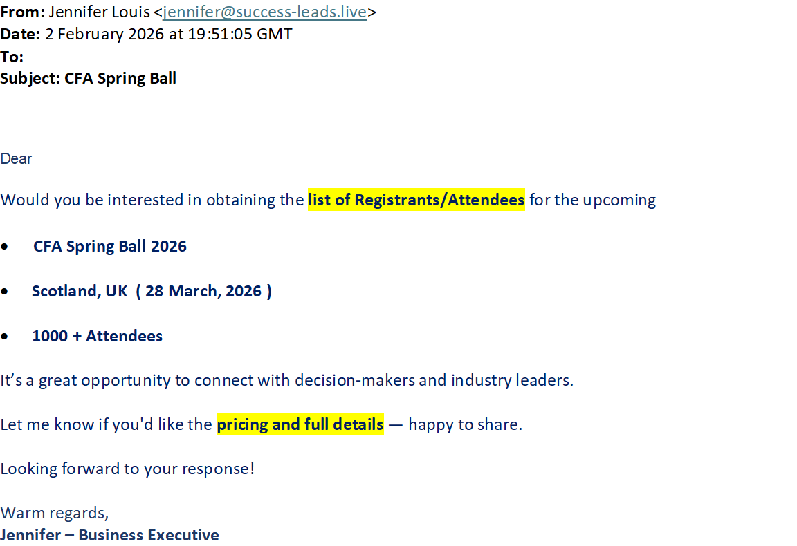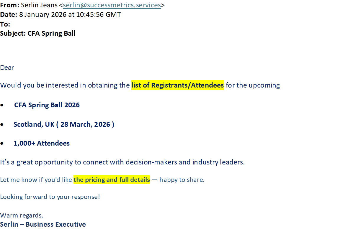 We can confirm that the CFA is NOT working with or in partnership with these senders or the related businesses. We want to reassure you that we do not generally share the CFA membership list with any third parties and should we ever enter into any partnerships with a third party for a project, we would ensure that members were made aware of this in advance.