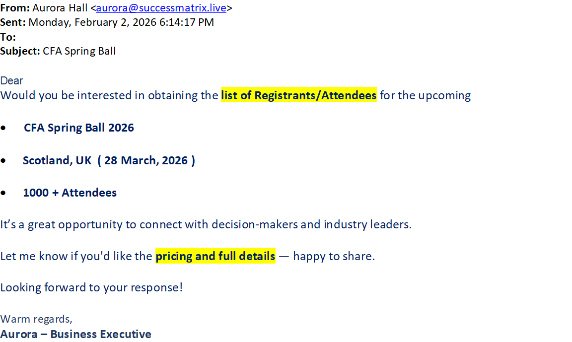 We can confirm that the CFA is NOT working with or in partnership with these senders or the related businesses. We want to reassure you that we do not generally share the CFA membership list with any third parties and should we ever enter into any partnerships with a third party for a project, we would ensure that members were made aware of this in advance.